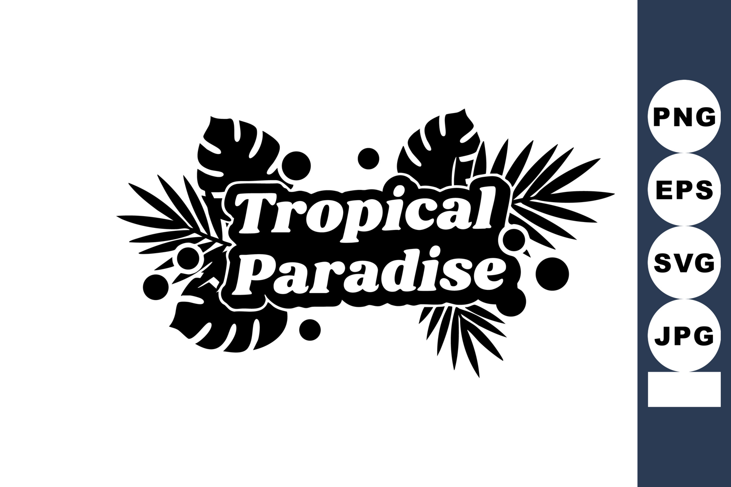 This vector design features tropical paradise text surrounded by black palm leaves and exotic foliage, creating a bold and stylish summer theme with natural elements. Elegant and striking mood.
