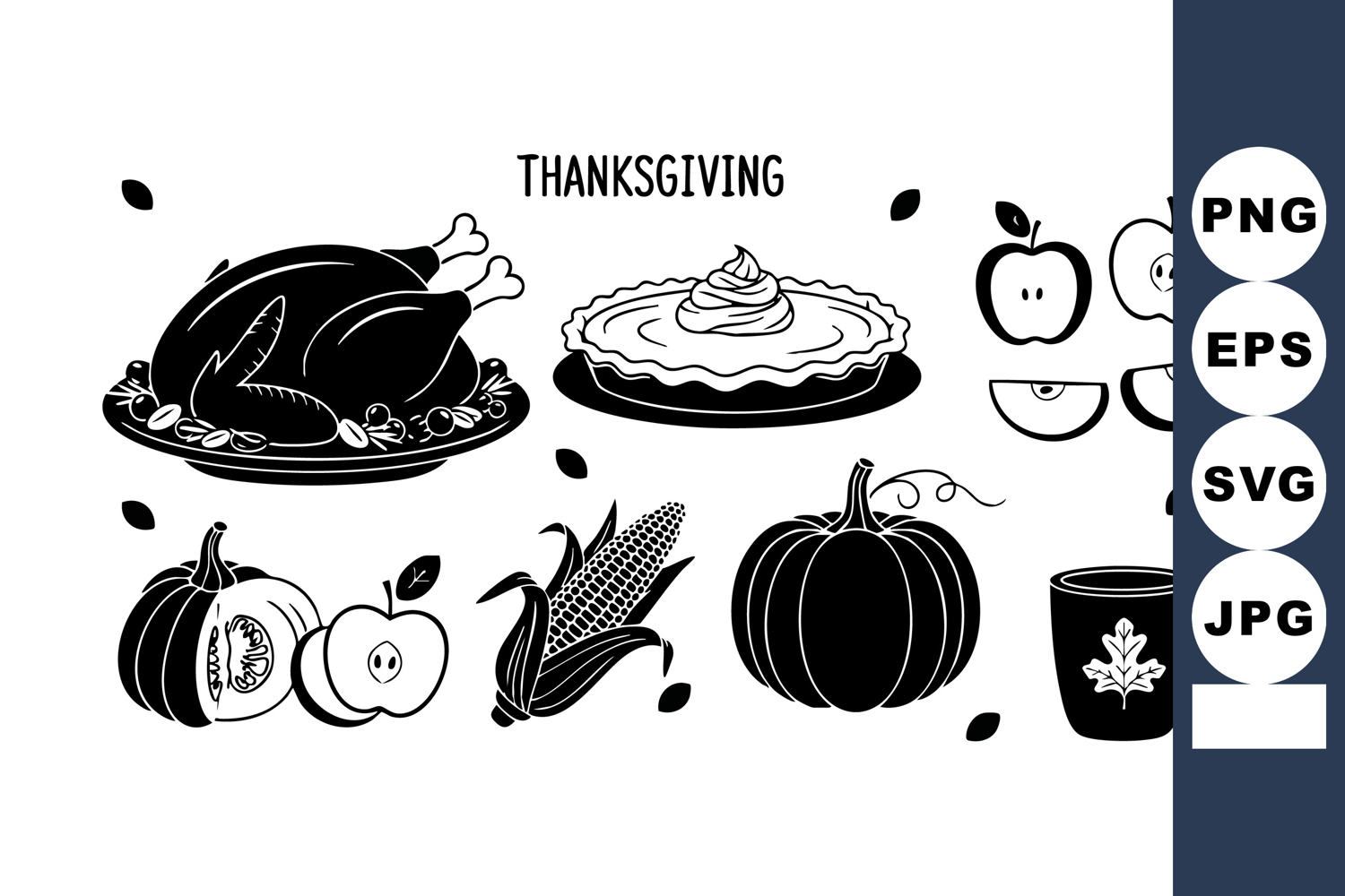 Vector image showing traditional Thanksgiving meal items including roasted turkey, pumpkin pie, apples, corn, and pumpkin in black and white style. Festive and cozy mood.