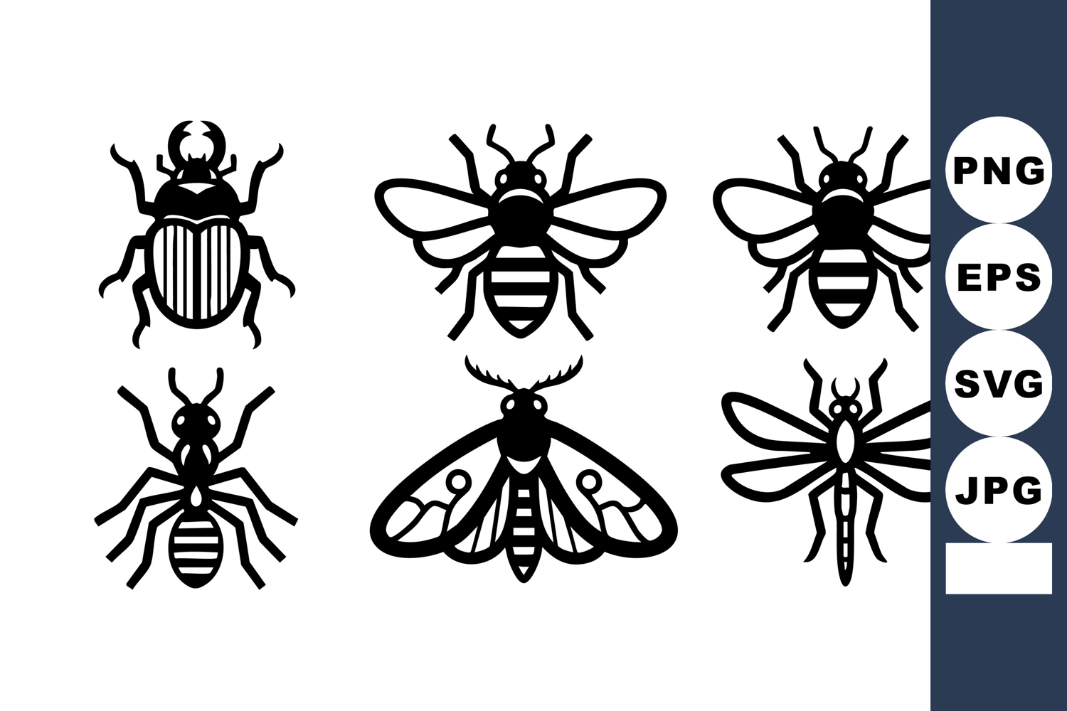 This vector set shows six insect silhouettes including beetle, two bees, ant, moth, and dragonfly in black and white. The clean design suits nature and entomology themes. Simple and bold mood.