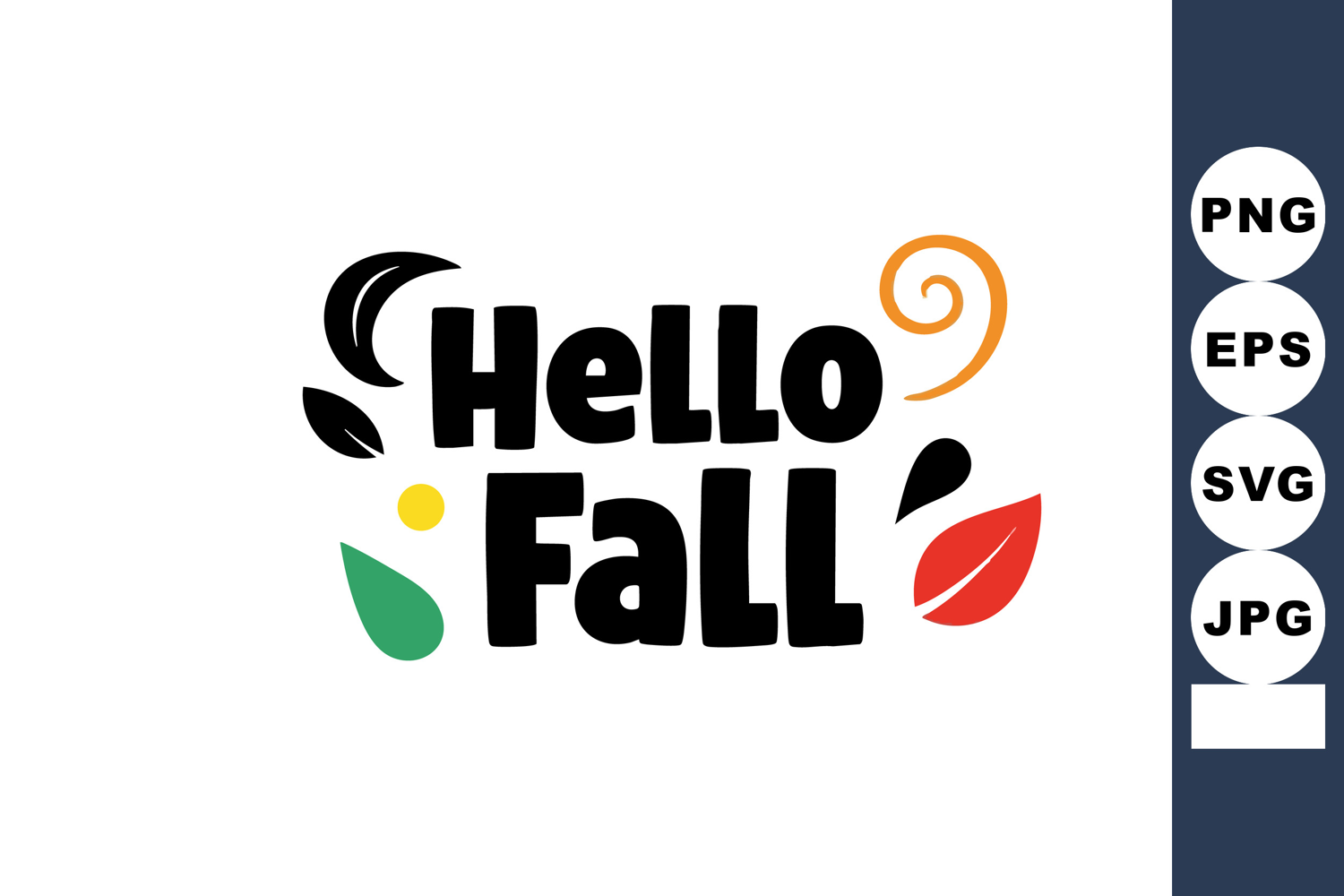 This vector features a playful Hello Fall text surrounded by colorful autumn leaves and swirls, capturing the essence of the fall season with vibrant and cheerful vibes.