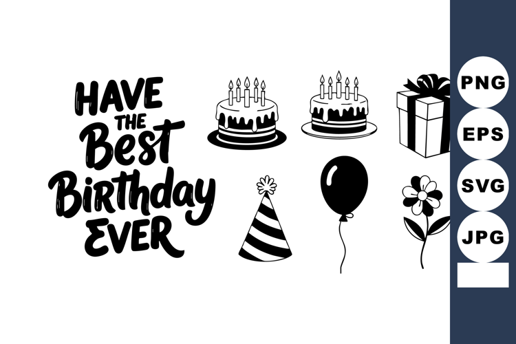 Black and white vector icons depict birthday celebration elements like cake, gift, balloon, party hat, flower, with festive lettering. Simple, cheerful, and elegant mood.