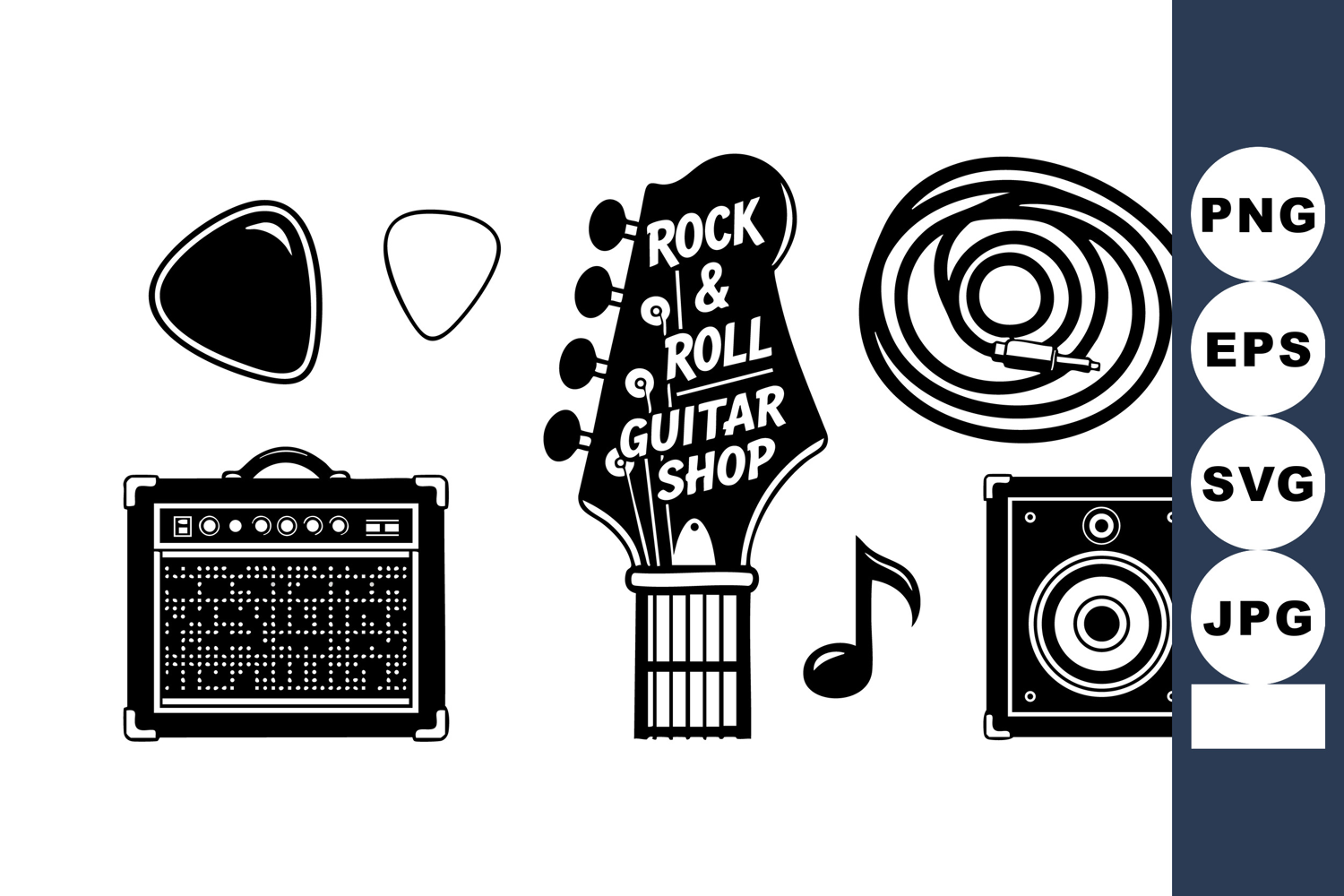 Vector illustration showing rock and roll guitar shop elements including guitar headstock, amplifier, speaker, picks, cable, and musical note in black and white style. Energetic vibe.