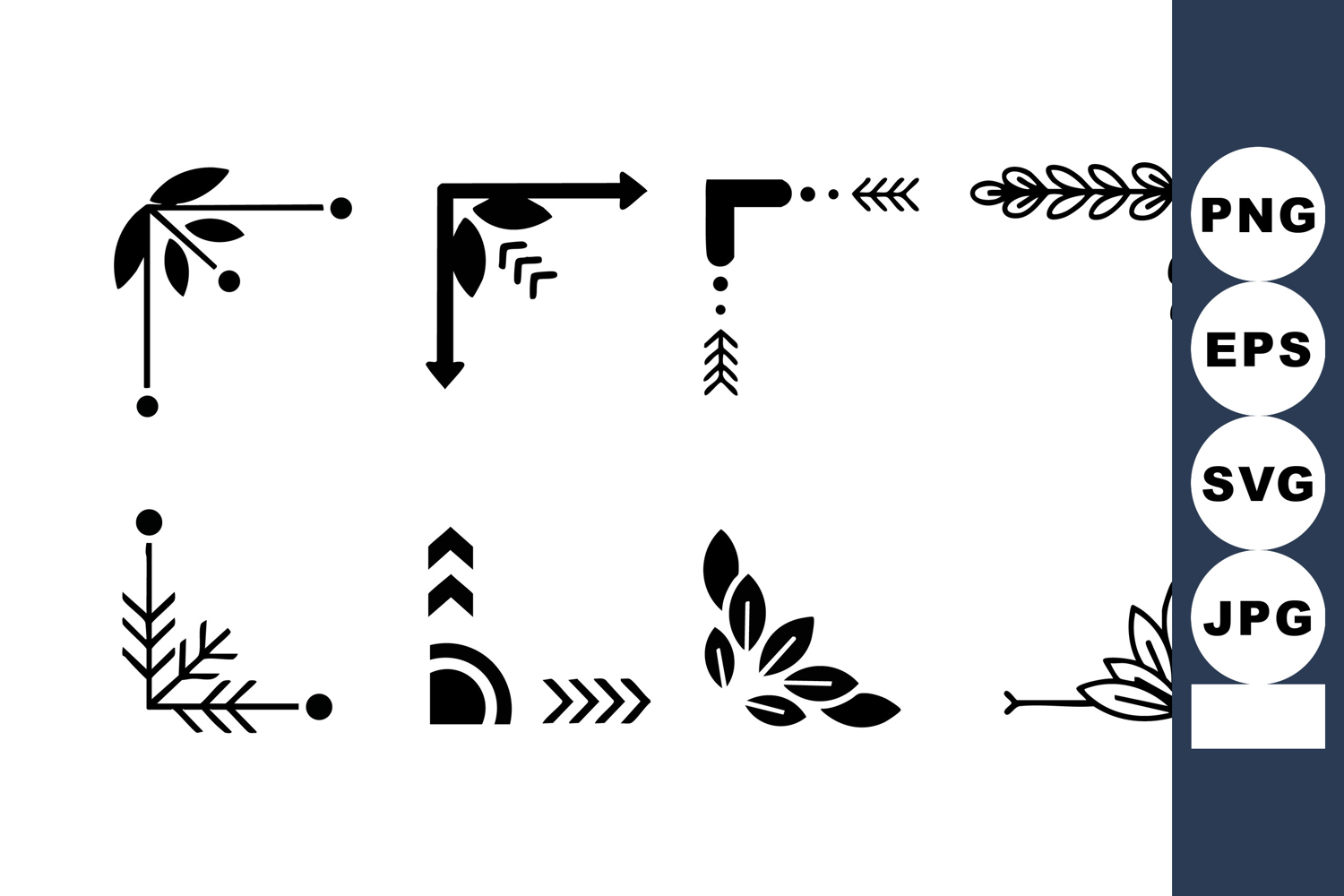 Set of black floral corner vector elements featuring leaves and arrows for creative design projects and decorative purposes, offering elegance and style. Calm mood.