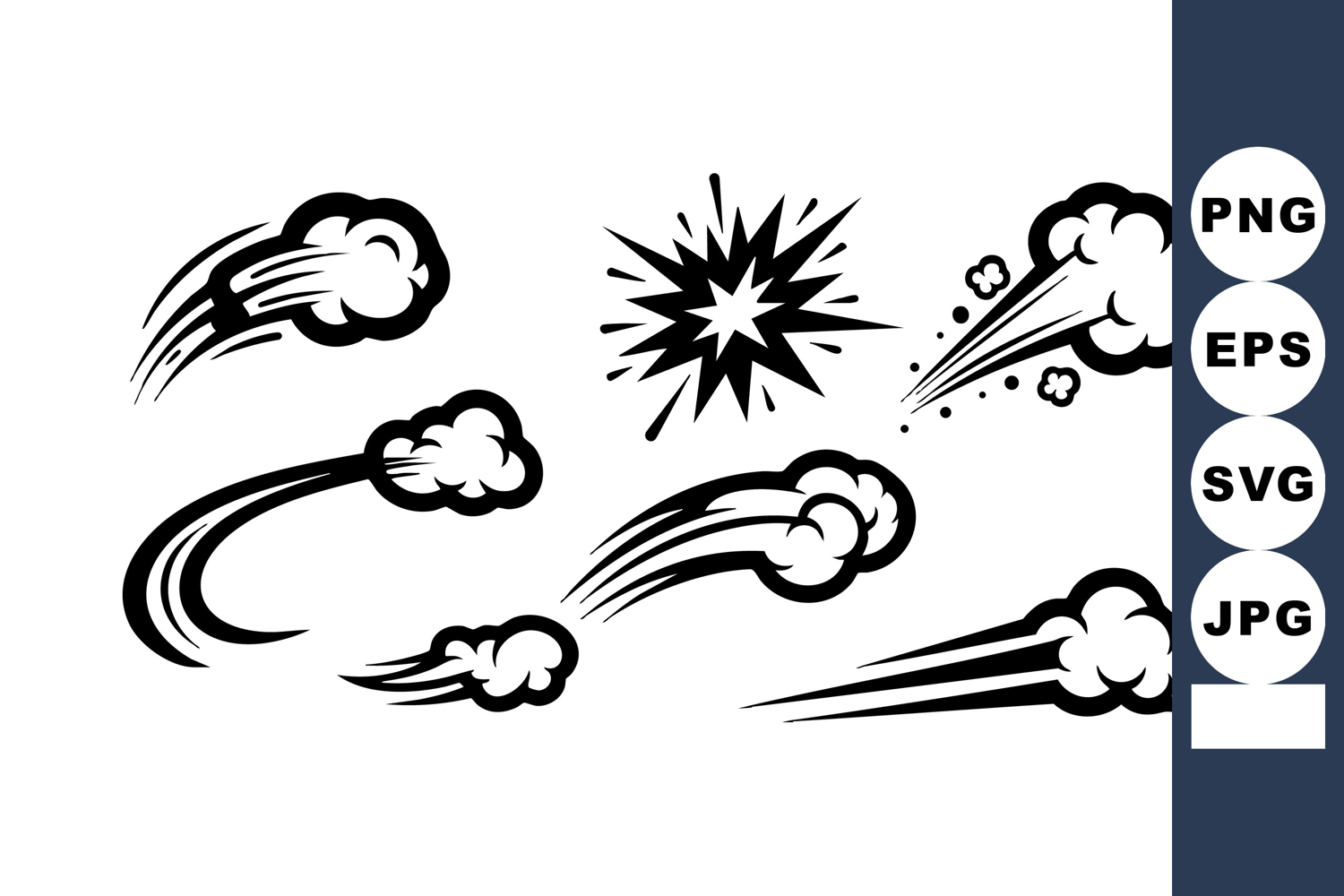 Vector set features black and white cartoon style comic smoke clouds and explosion effects, designed for dynamic graphic design and illustration projects. Energetic and playful mood.