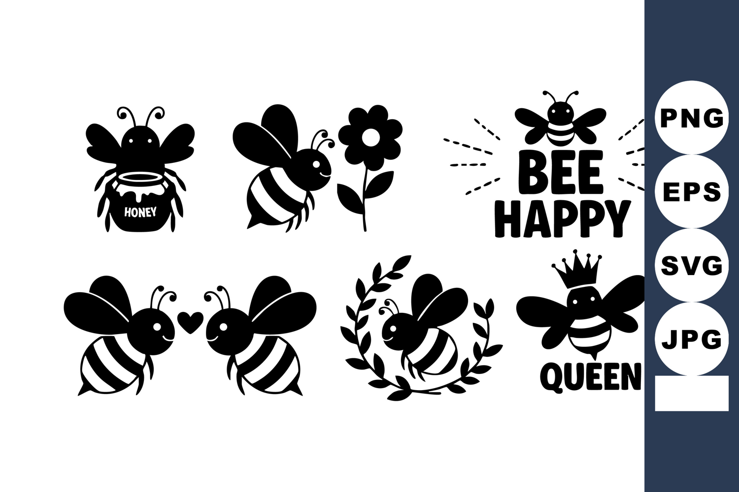 This vector set features cute bee icons including a honey jar, flower, happy bee message, and queen bee with crown, perfect for nature and insect design projects, cheerful mood.
