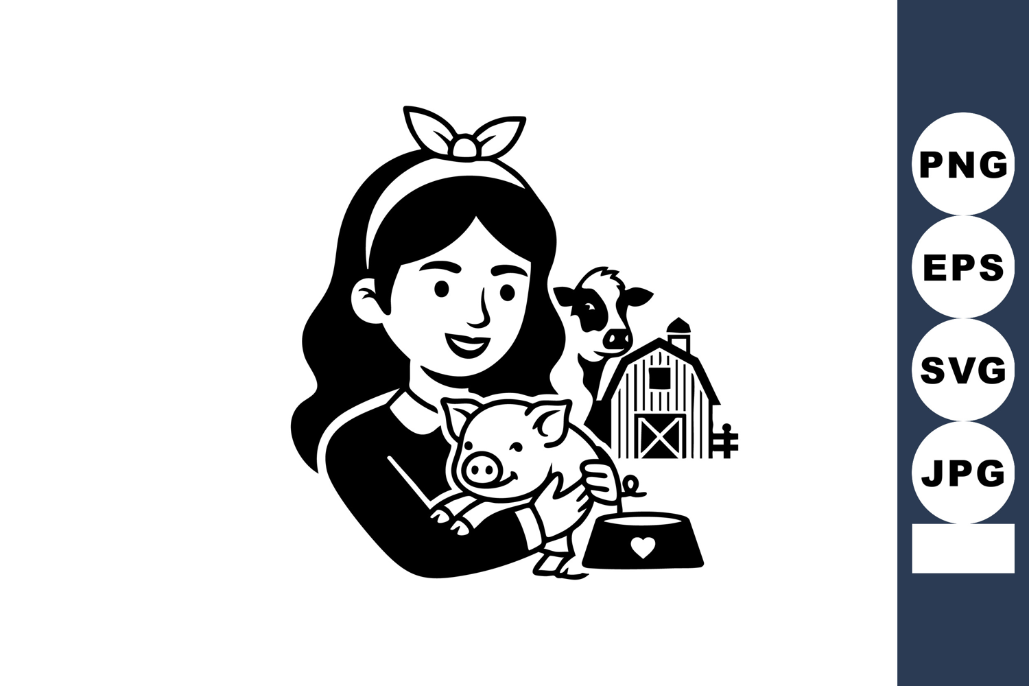 Illustration shows a smiling girl holding a piglet near a cow and a barn with a food bowl, depicting a peaceful rural farm life scene, cheerful mood.
