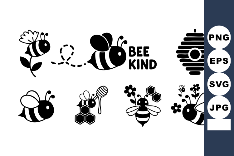This vector file presents charming bee illustrations accompanied by honeycombs, flowers, and a kindness message in black and white. It conveys nature and positivity with a cheerful mood.