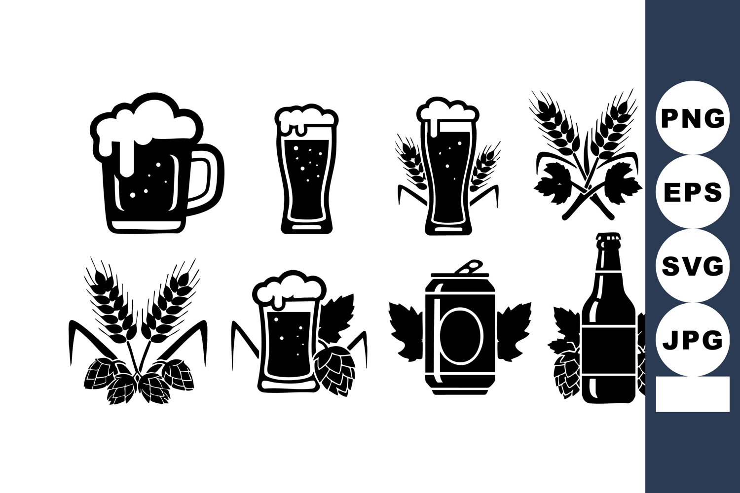 Vector image shows beer icons including mug, glass, bottle, can, and barley in black silhouette style for beverage design and brewing concepts. Clear and bold mood.