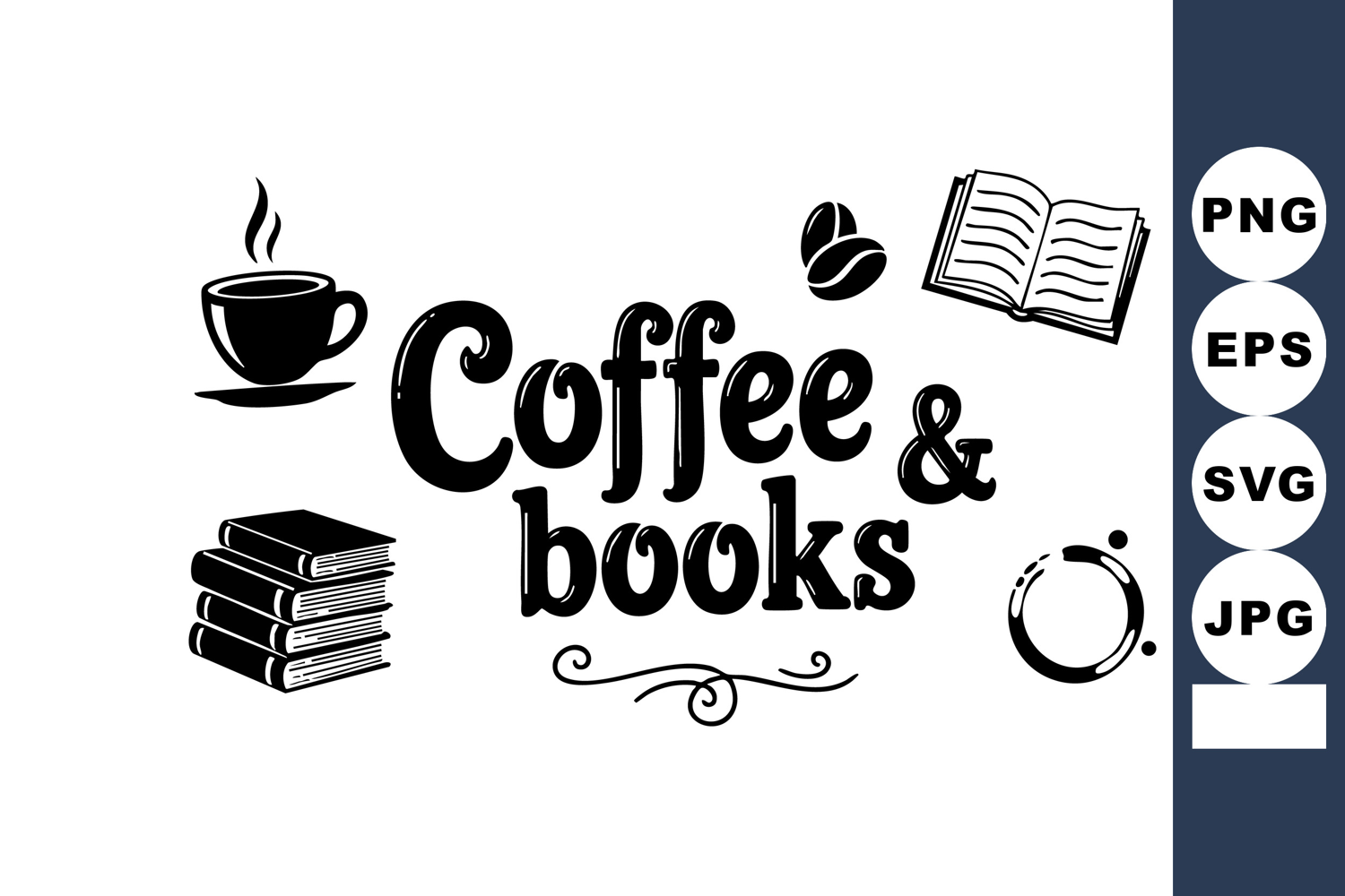 This vector design shows the phrase coffee & books surrounded by icons of a steaming cup, coffee bean, open book, stack of books, and coffee ring. It conveys warmth and comfort. Relaxed mood.