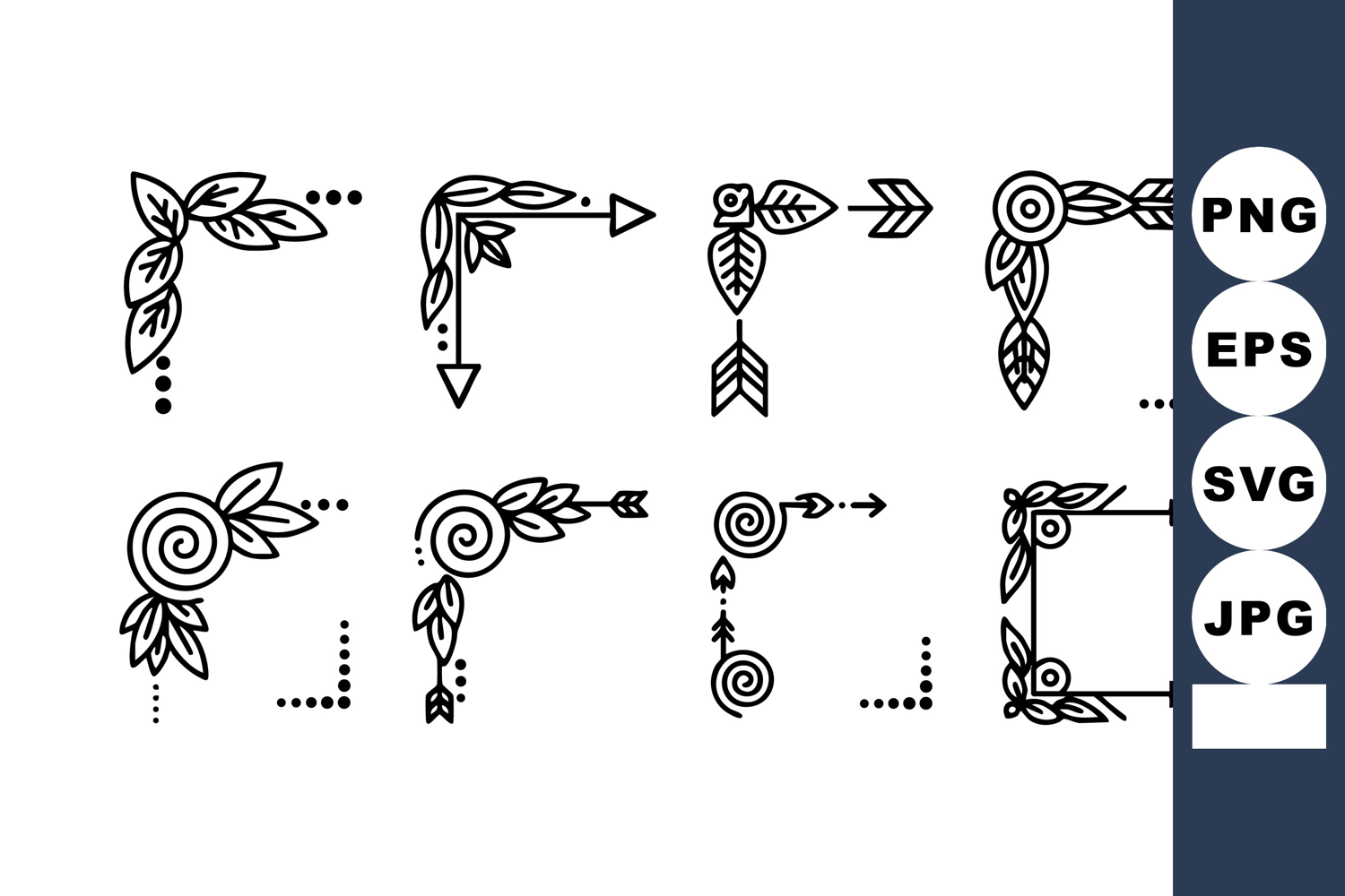 This vector set features decorative floral corner arrows with leaves and spiral motifs, ideal for creative design work. The black and white style offers elegant simplicity. Artistic mood.