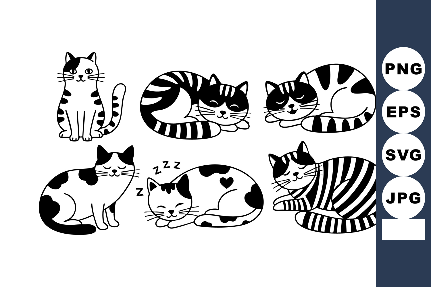 This vector illustration shows five black and white cats in different resting and sitting positions, featuring stripes and heart patterns, creating a playful and charming mood.