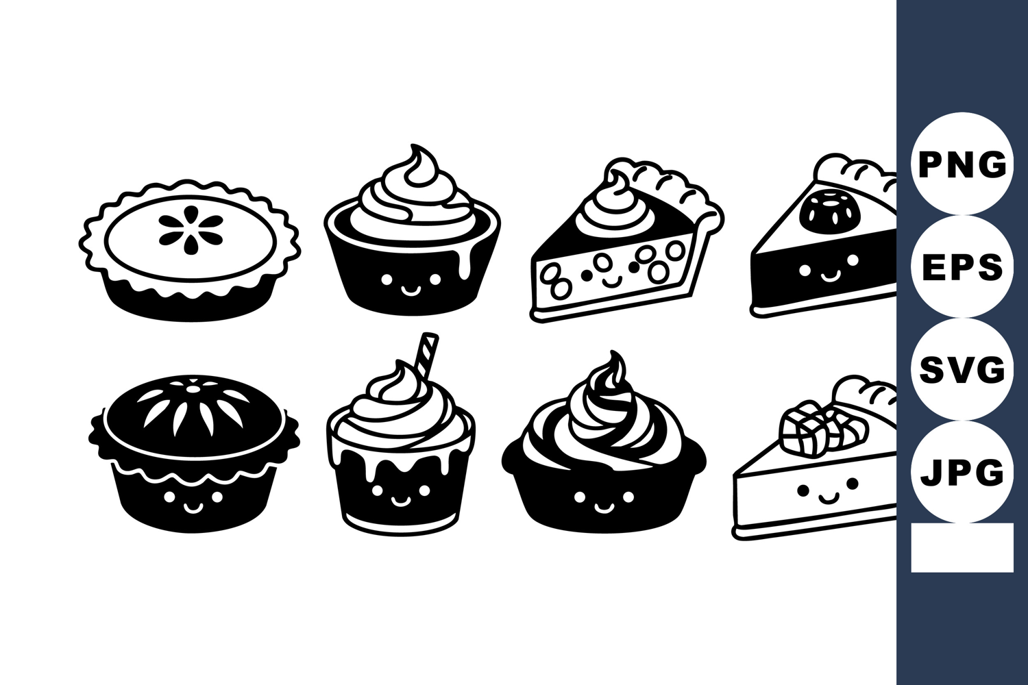 This vector features adorable black and white pies and cupcakes in a cartoon style, perfect for bakery branding and dessert menus, conveying a fun and playful mood.