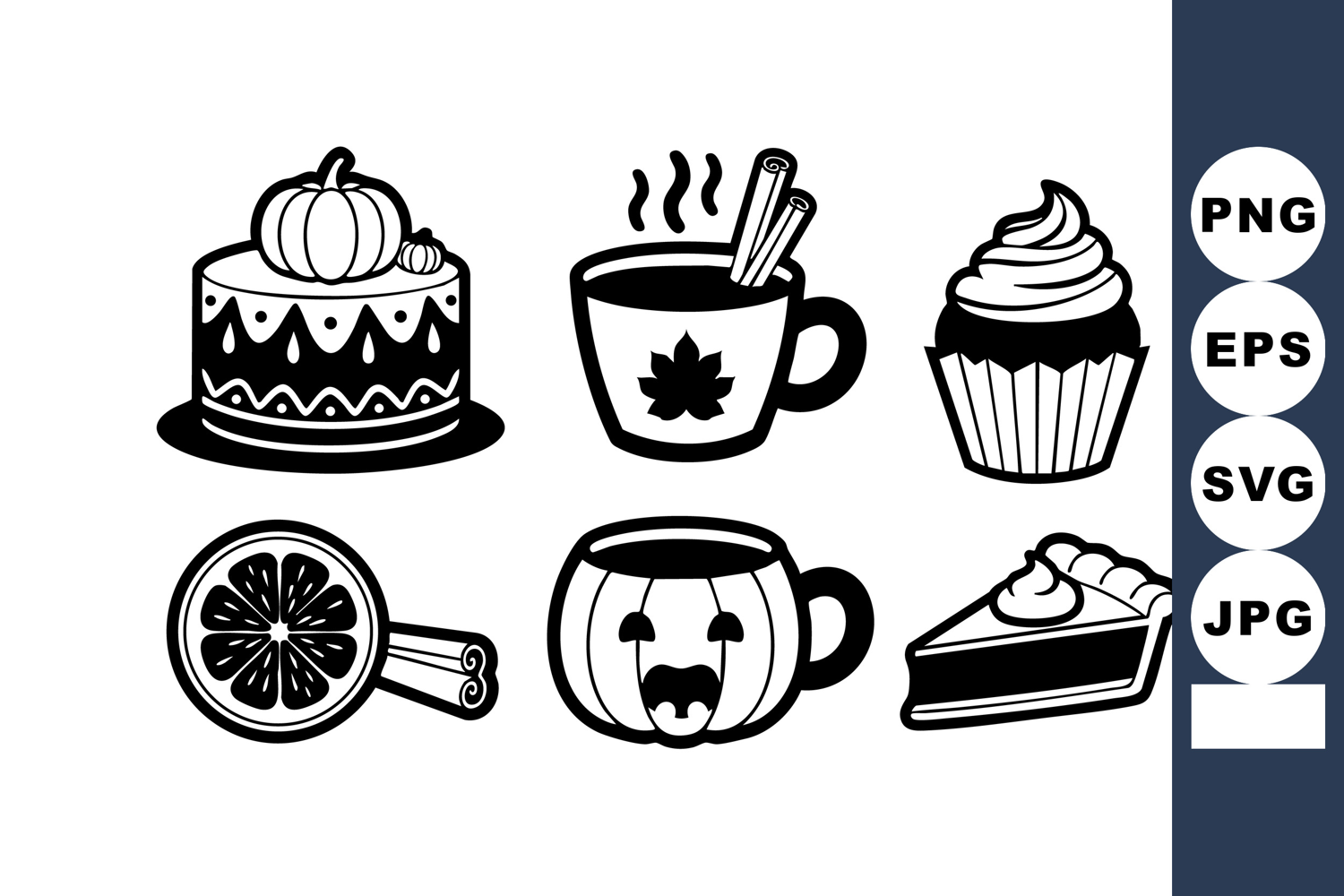 Vector set features autumn-themed desserts and drinks including pumpkin cake, hot spiced beverage, cupcake, citrus slice, jack-o-lantern mug, and slice of pie, evoking cozy seasonal mood.
