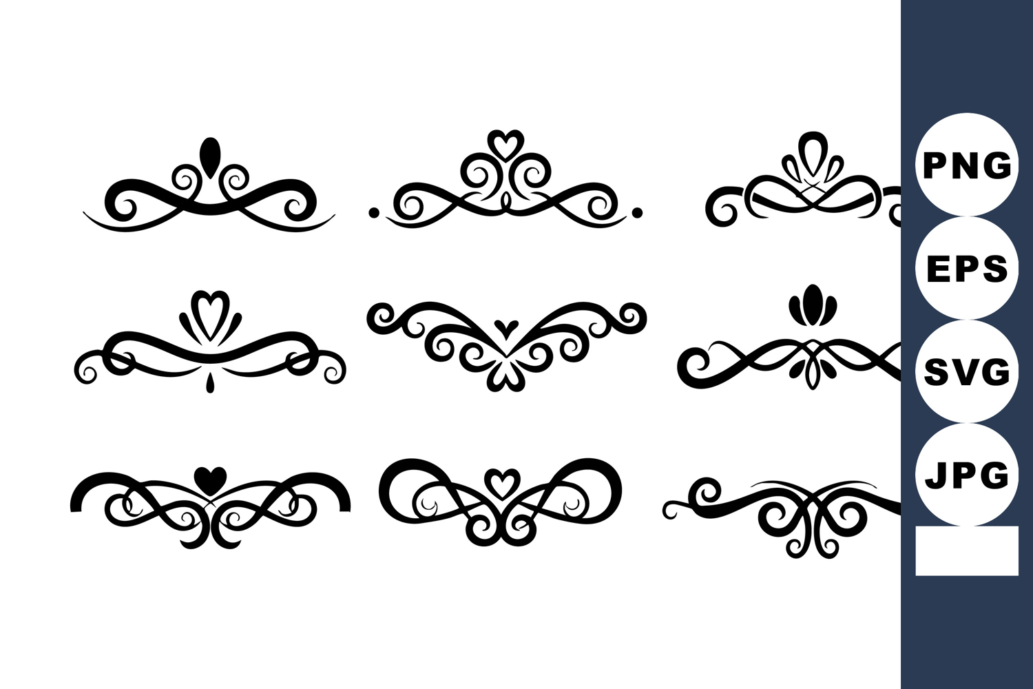 Set of nine decorative black vector flourishes featuring heart motifs and swirls, ideal for elegant vintage design, invitations, and borders. Classic and stylish mood.