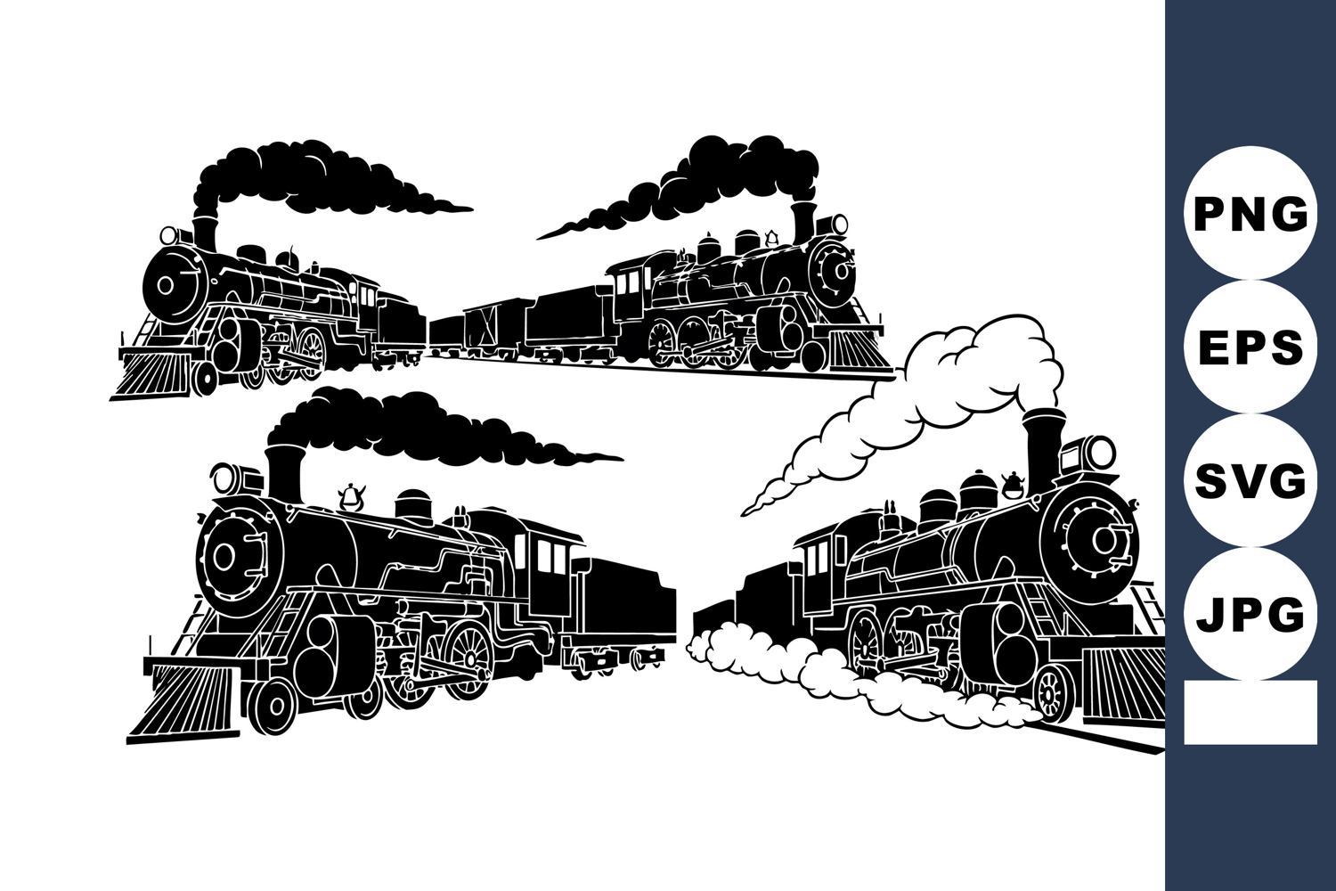 This vector features three vintage steam locomotives emitting smoke with detailed train cars in motion. The black and white design highlights classic transportation themes. Nostalgic mood.