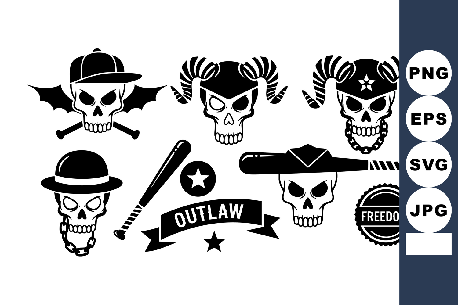 Vector collection of skulls wearing hats and horns with bats, crossed bones, and freedom symbols representing outlaw and rebellious spirit in black and white style. Bold and edgy mood.