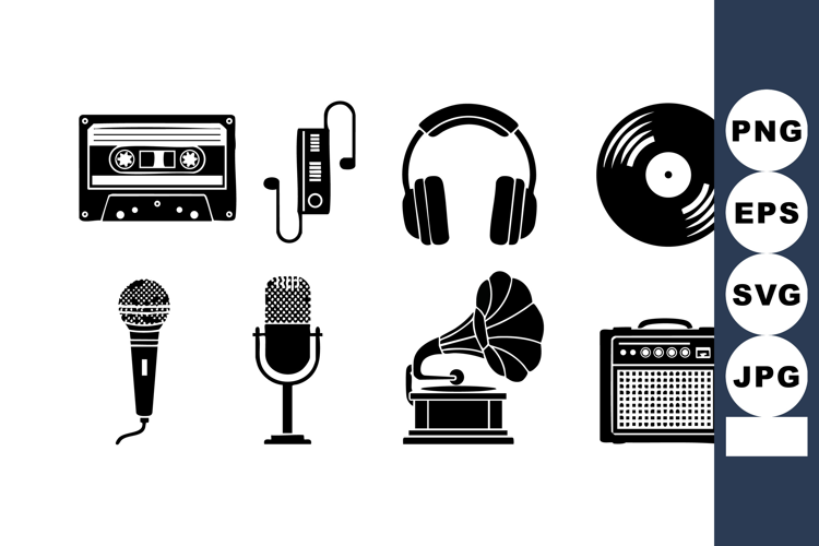 Vector collection of vintage audio equipment icons featuring cassette tape, headphones, microphones, gramophone, and amplifier in black silhouette style. Retro music concept, creative and nostalgic.