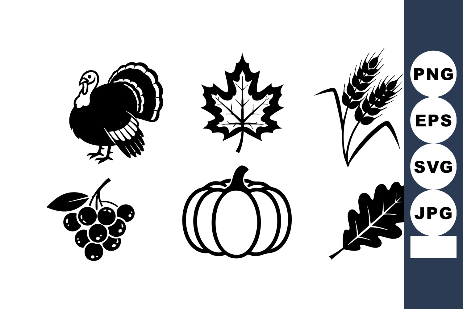 Set of black silhouette Thanksgiving icons featuring turkey, pumpkin, grape cluster, oak leaf, maple leaf, and wheat stalks representing autumn harvest and celebration mood.