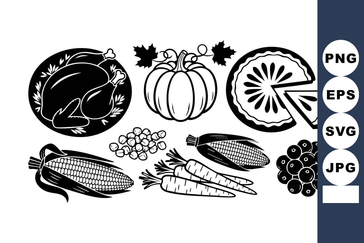 This black and white vector shows a Thanksgiving harvest with turkey, pumpkin, corn, carrots, grapes, and orange slices in a simple style, creating a festive and rustic mood.