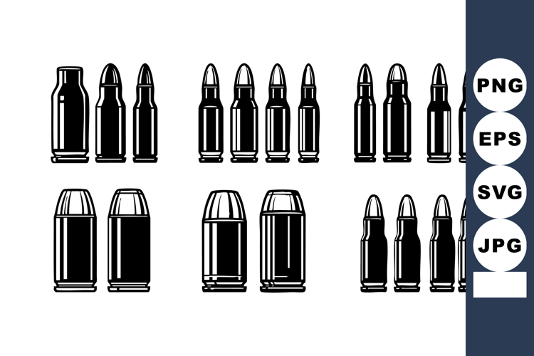 Vector graphic showing various bullet cartridges with distinct shapes and calibers, ideal for shooting, weapons, and ammunition concepts in black and white style. Clean and sharp. Neutral mood.