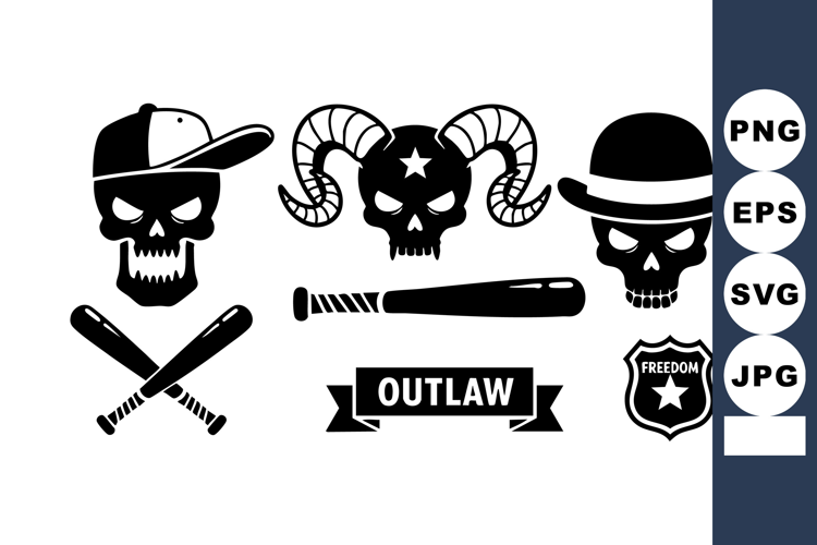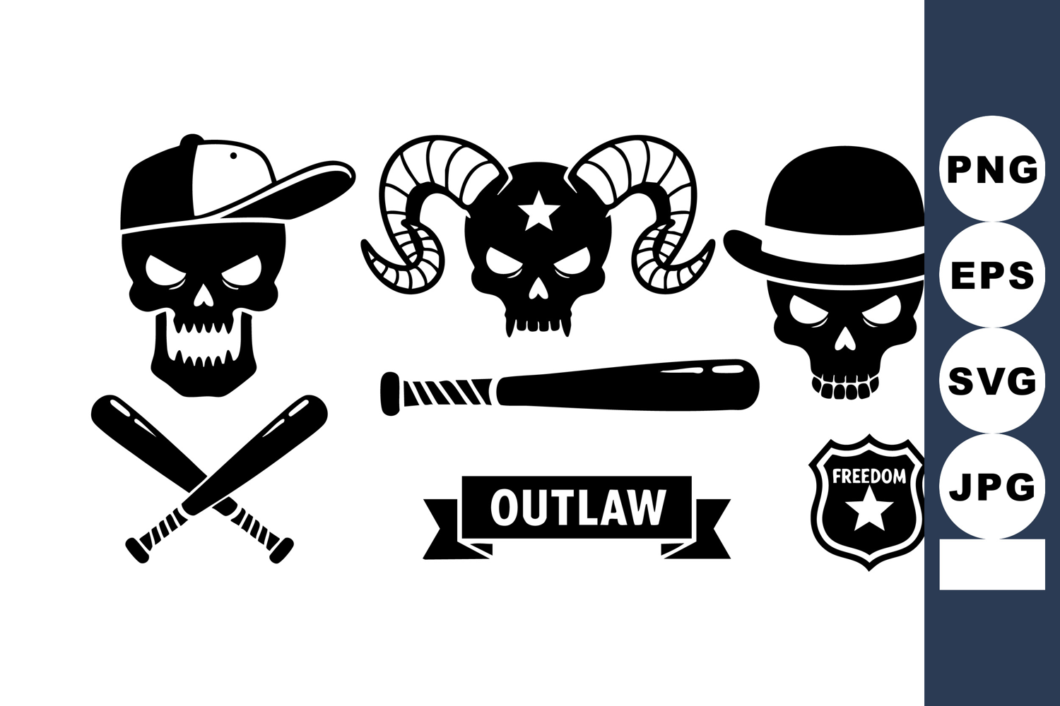 Outlaw skulls with baseball bats, ram horns, bowler hat, and example image 1