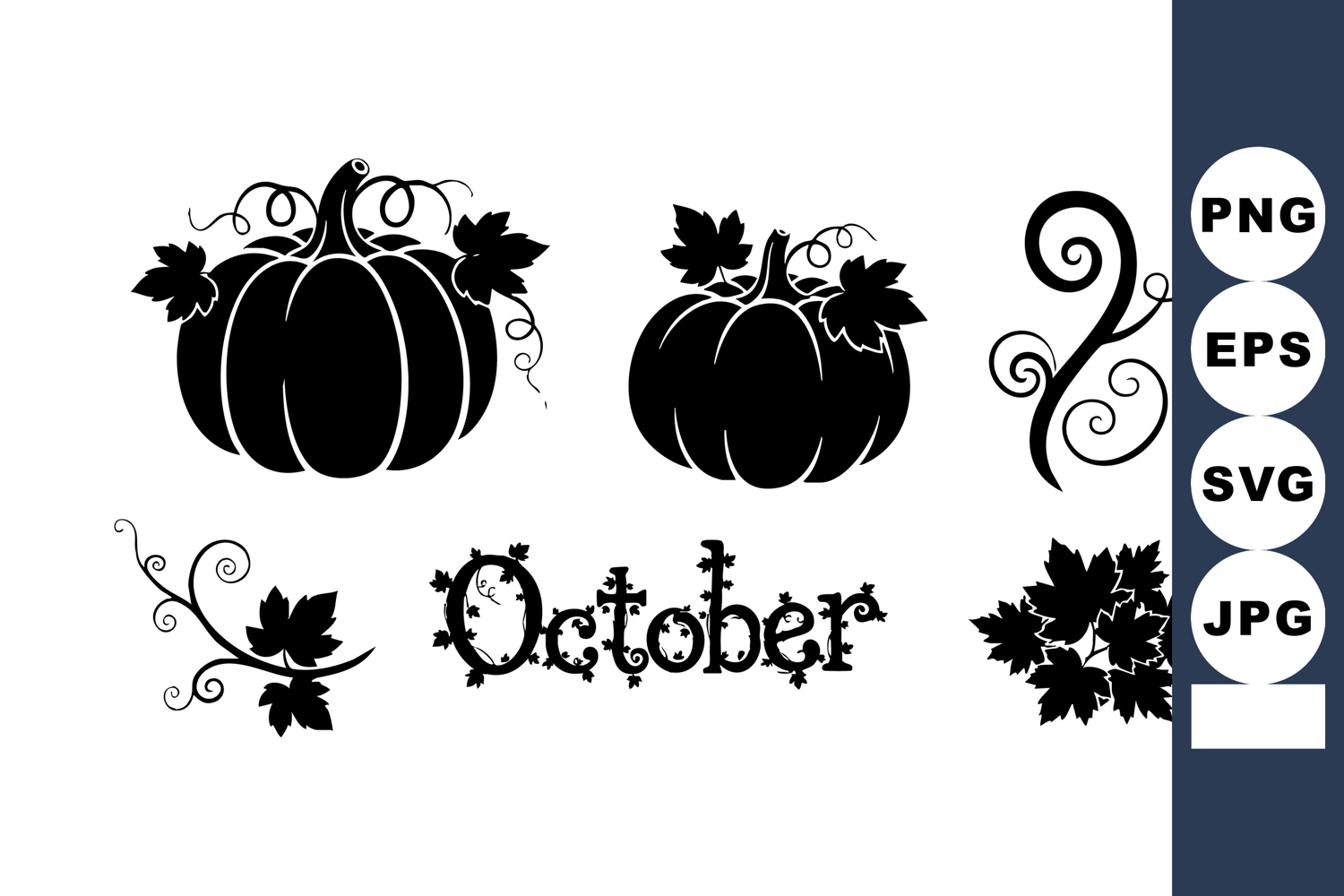Vector illustration features black silhouette pumpkins, swirling vine designs, autumn leaves, and stylized October text, representing fall season and Halloween themes in a clean, minimal style. Calm mood.