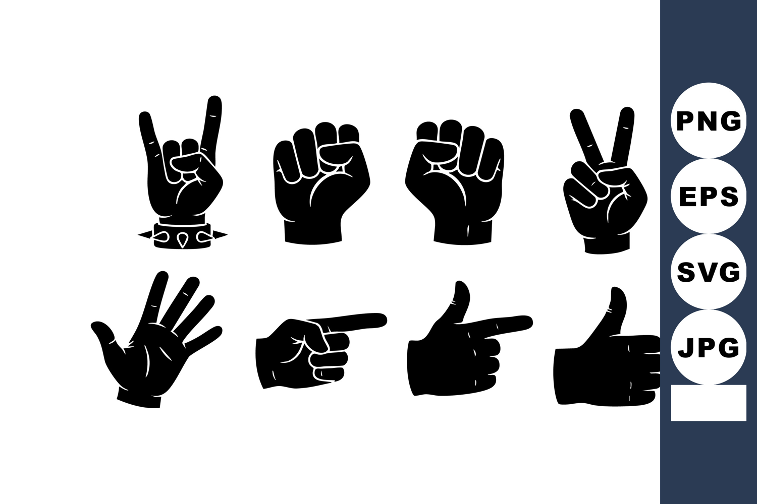 This vector image shows black silhouette hand gestures including rock sign, raised fists, peace, open hand, pointing, finger gun, and thumbs up in a clean flat style. Expressive and bold mood.
