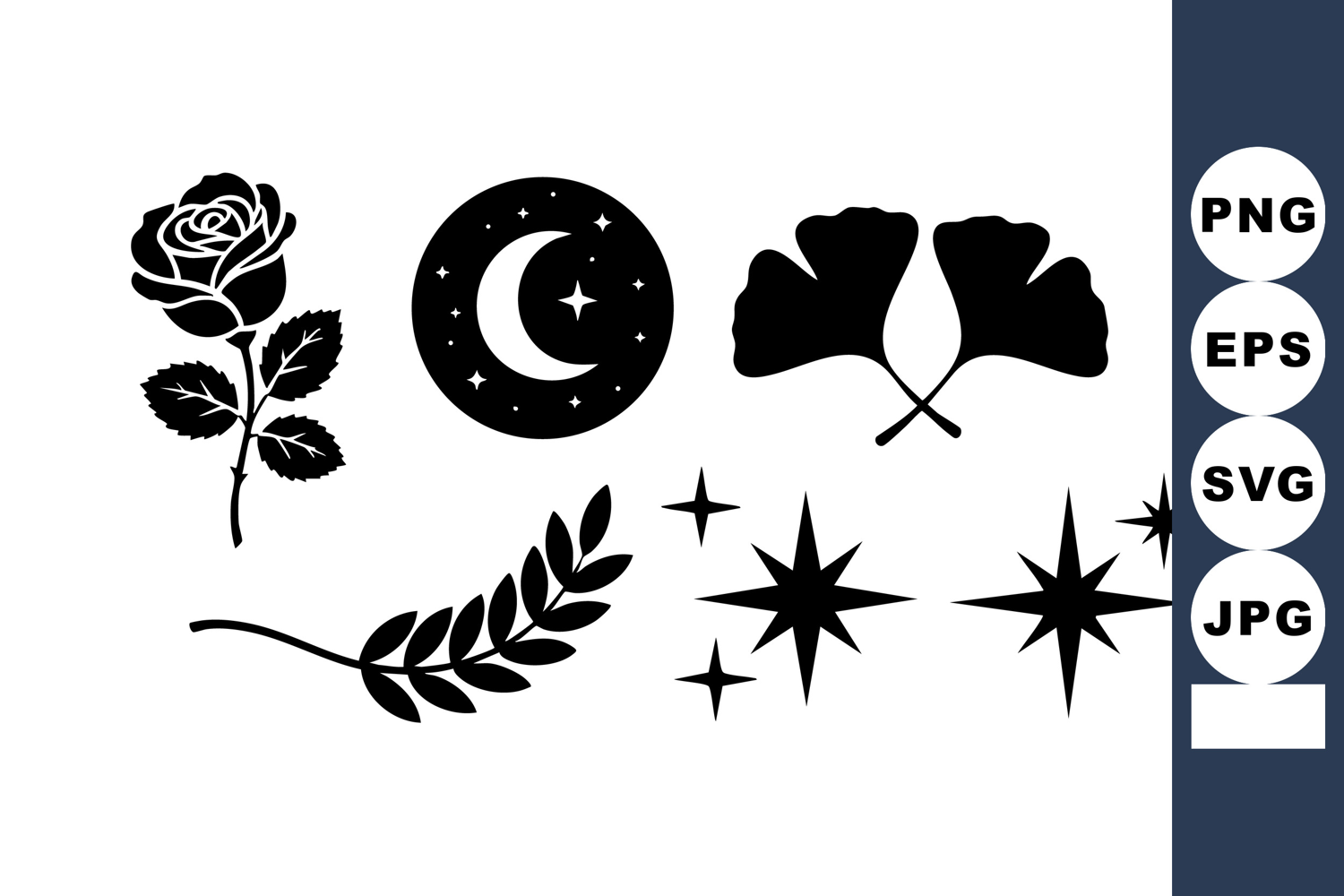 Illustration Vector Black Flower Silhouette Rose Moon Ginkgo Stars Crescent