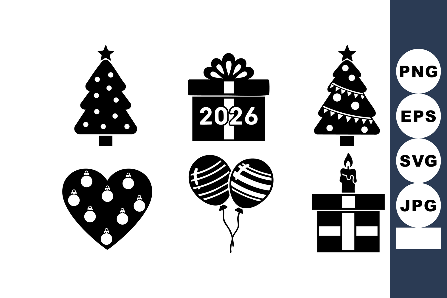 Black and white vector icons depict Christmas and New Year 2026 symbols including decorated trees, gift boxes, balloons, candle, and heart ornament, conveying festive and celebratory mood.