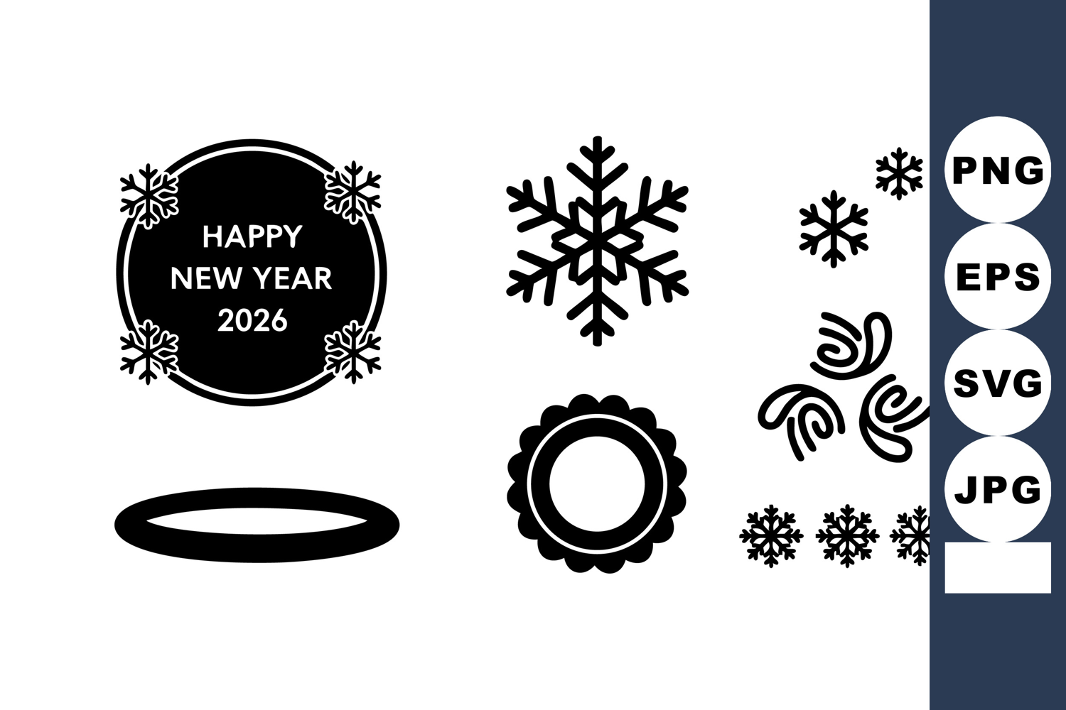 Vector set features black snowflake icons and frames for New Year 2026 designs. Elegant winter holiday elements with crisp shapes create a festive atmosphere. Calm mood.