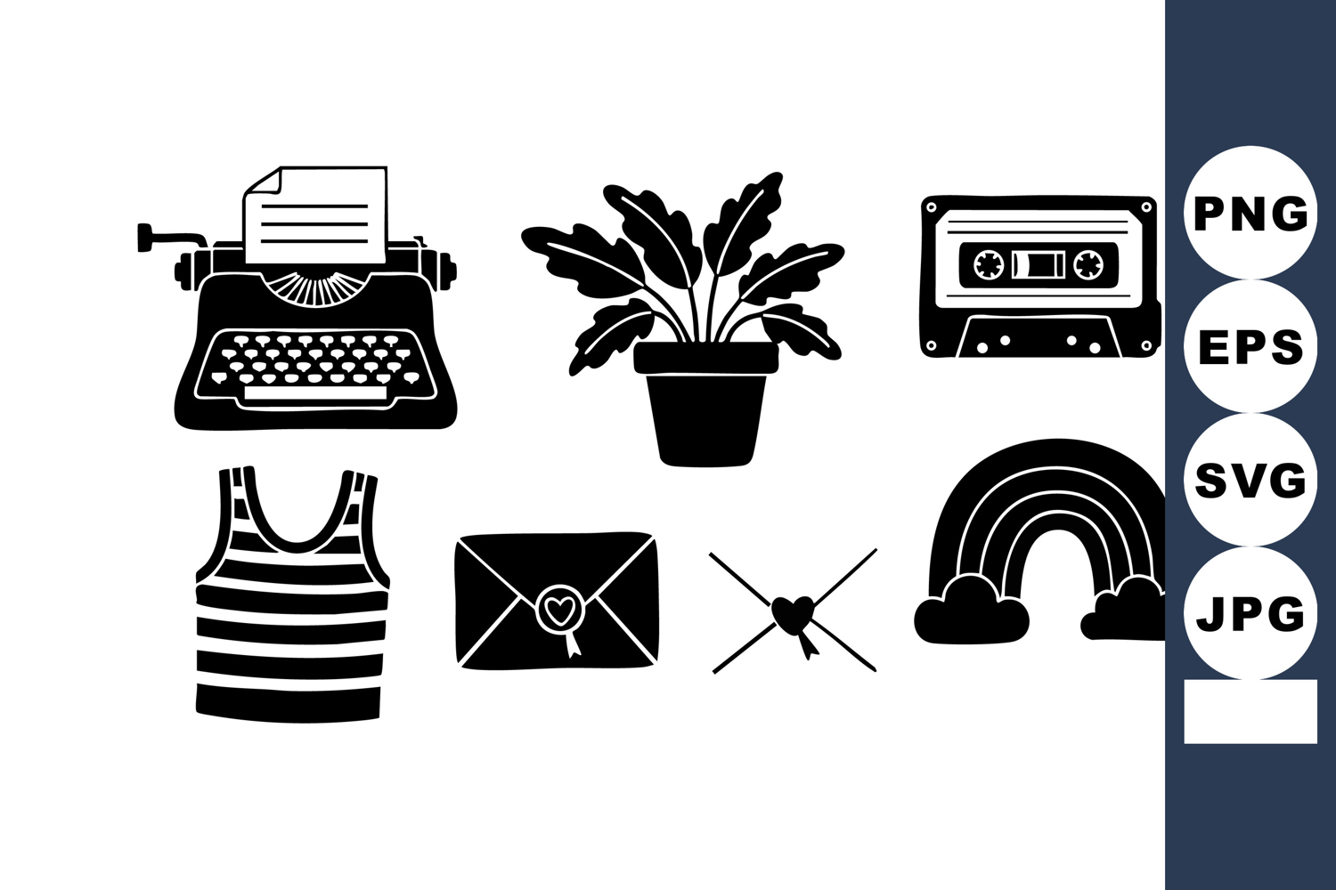 Black silhouette vector icons featuring vintage typewriter, cassette tape, striped tank top, sealed envelope, potted plant, rainbow, heart, and clock. Simple and clean design with nostalgic mood.