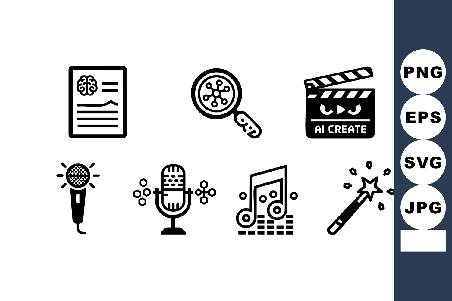 This vector features icons representing AI technology, microphone, music notes, magic wand, and clapperboard with a modern minimal style. Suitable for creative and digital projects, inspiring innovation and imagination. Energetic mood.