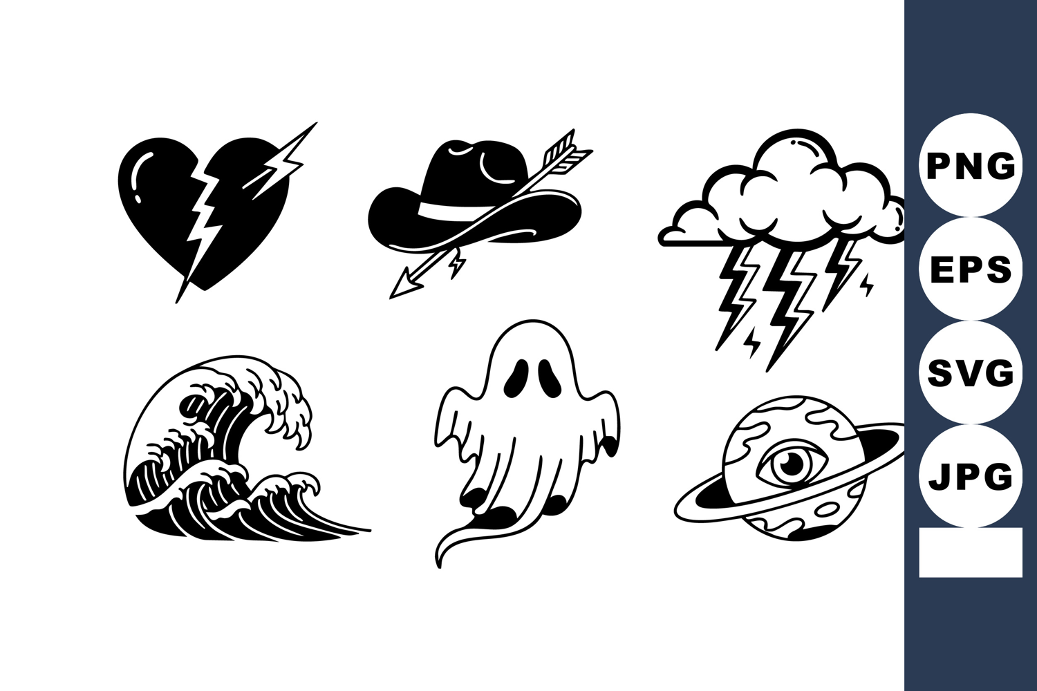 This set of black and white vector icons includes a broken heart, cowboy hat with arrow, thundercloud with lightning, ocean wave, ghost, and planet with an eye, presented in a minimalist style. Mysterious mood.