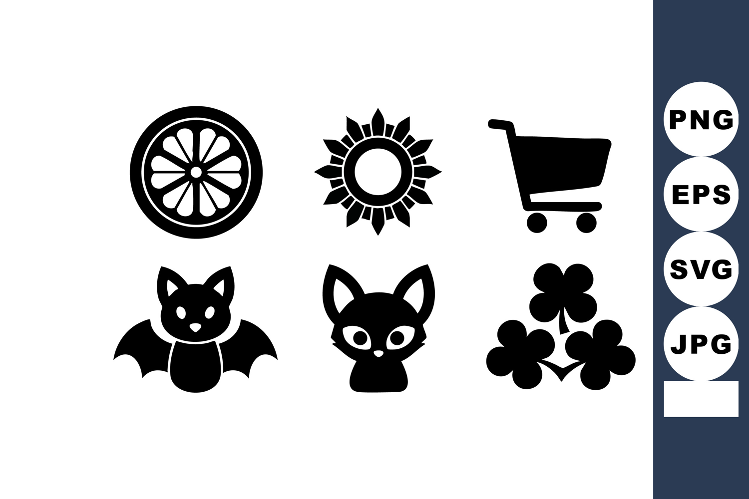 Vector icons display Halloween-themed elements like pumpkin slice, sunflower, shopping cart, bat, black cat, and clover leaf in black silhouette style, perfect for spooky and festive mood.
