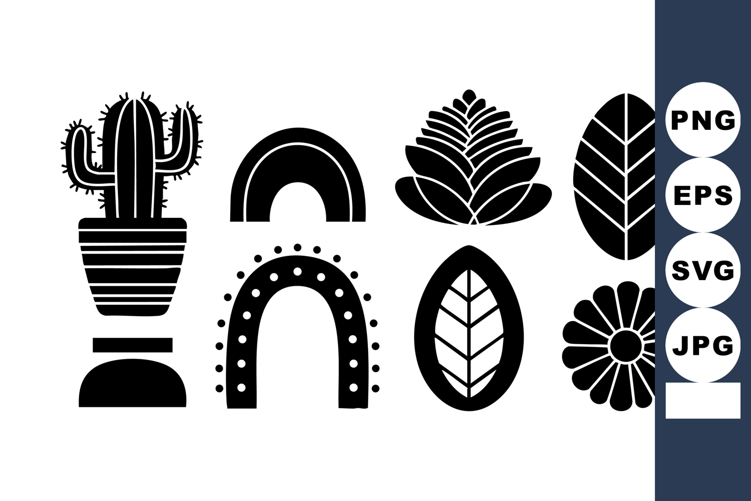 Black silhouette vector icons of cactus, rainbow, leaves, an example image 1
