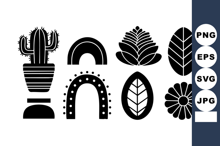 This vector features black silhouette icons including cactus, rainbow, leaves, and flower shapes. Ideal for decoration and creative design work, presented in a clean and minimal style. Calm.