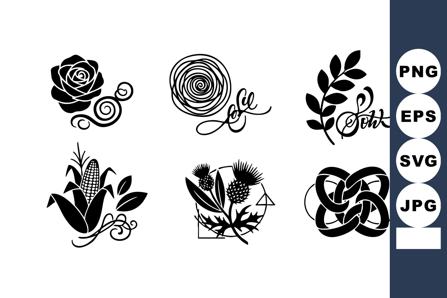 Vector set features black silhouette floral and botanical icons including rose, corn, thistle, leaf, and knot elements in a clean style. Suitable for design projects. Elegant mood.