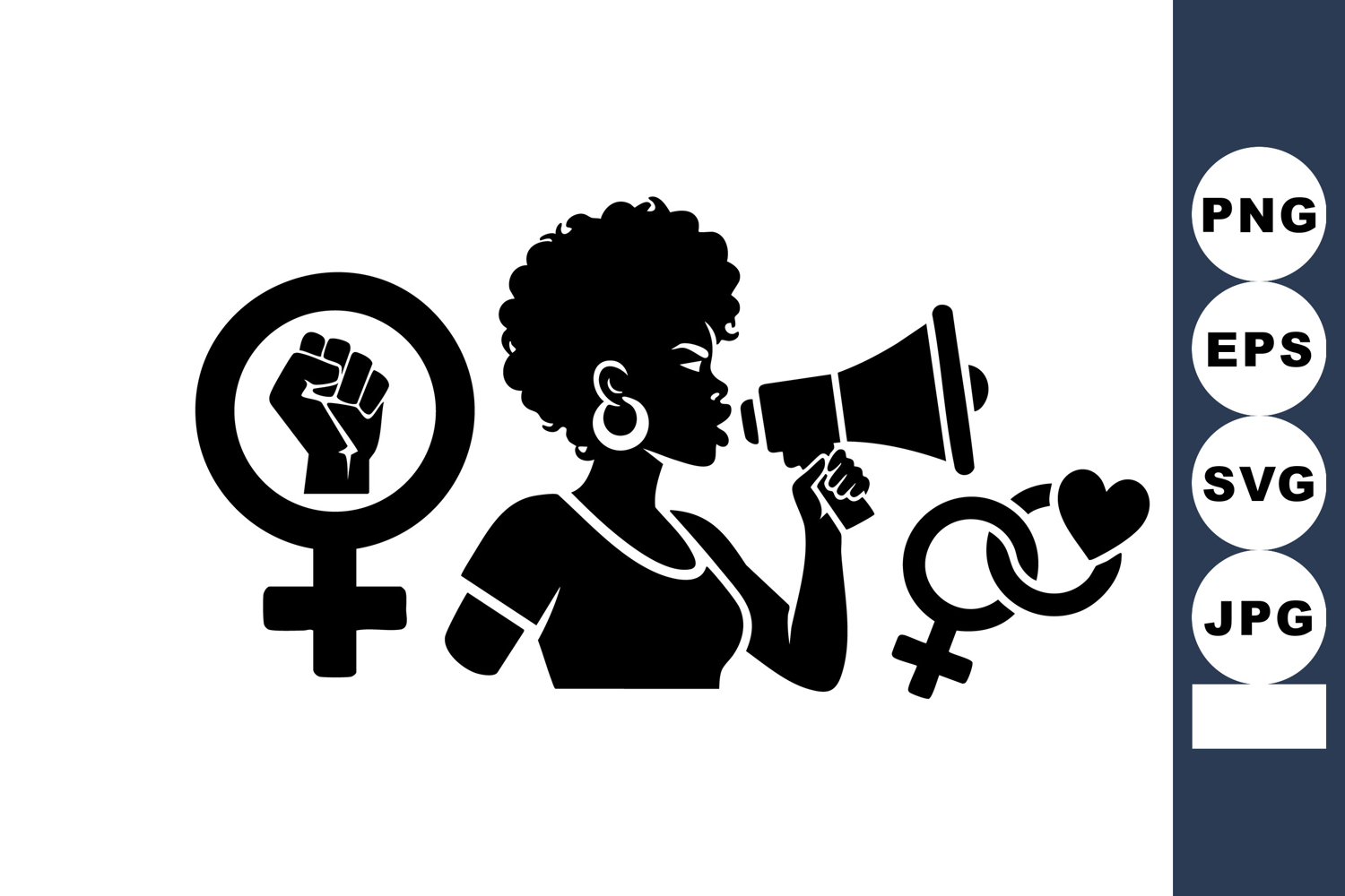 Silhouette of a woman with afro hairstyle and hoop earrings speaking into a megaphone surrounded by female gender and heart icons representing feminism and empowerment, bold mood.