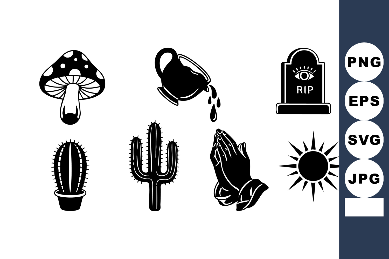 This vector collection features black and white icons of a mushroom, cactus, praying hands, sun, and gravestone in a simple style, presenting a spiritual and natural theme. Calm mood.