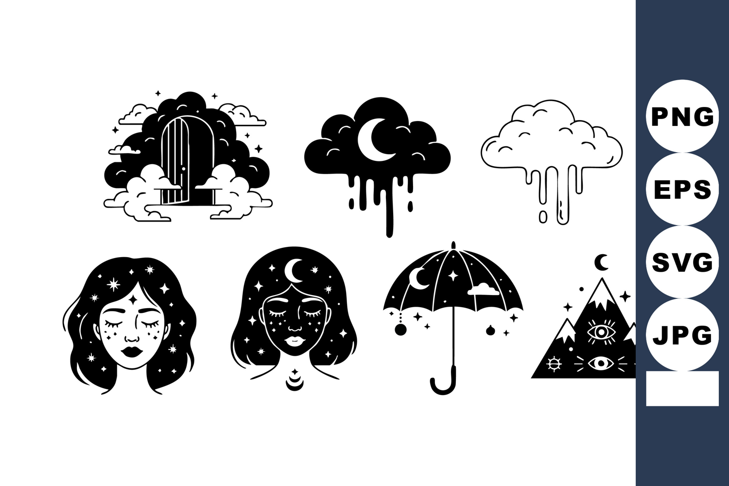 This vector set features mystical black and white illustrations including clouds with door, moon, rain, female faces, umbrella, and all-seeing eye pyramid, evoking mystery and fantasy mood.