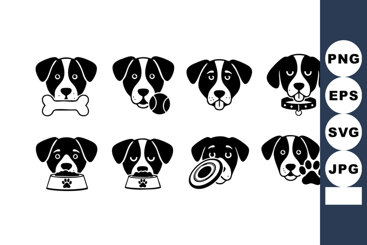 Vector set of dog icons showing different playful expressions and accessories such as bone, ball, collar, bowl, frisbee, and paw print in black and white style, cheerful mood.