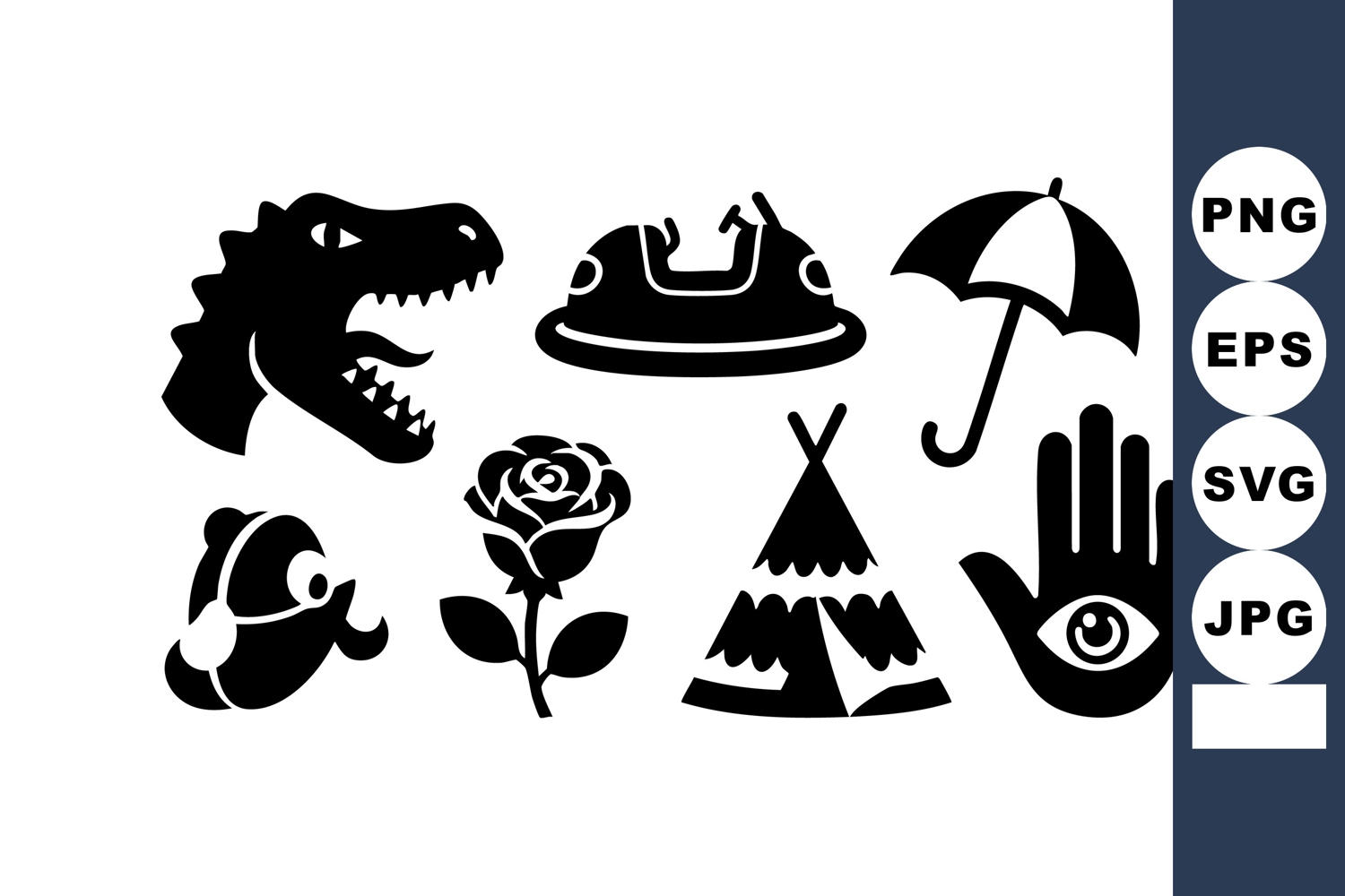 This vector features black silhouette icons of various objects including a dinosaur head, firefighter helmet, umbrella, fish, rose, teepee, and a hand with an eye symbol, presented clearly and simply. Minimalistic and bold design.