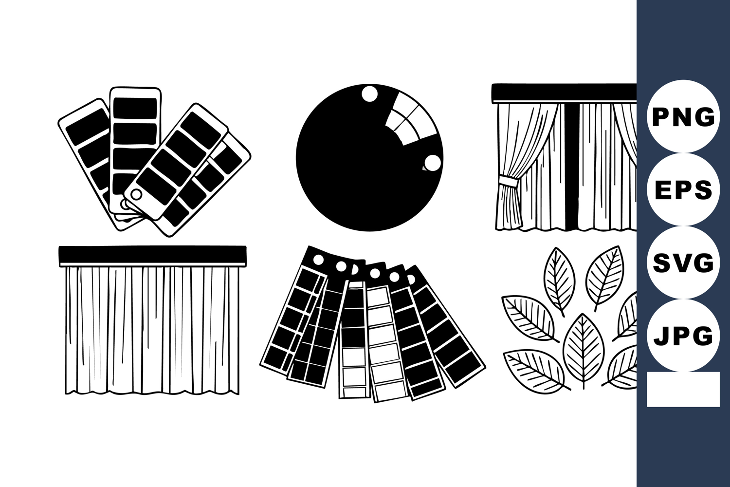 This vector set features paint color swatches, curtain designs, fabric samples, and leaf icons in black and white, ideal for design and decoration projects. Artistic and versatile.