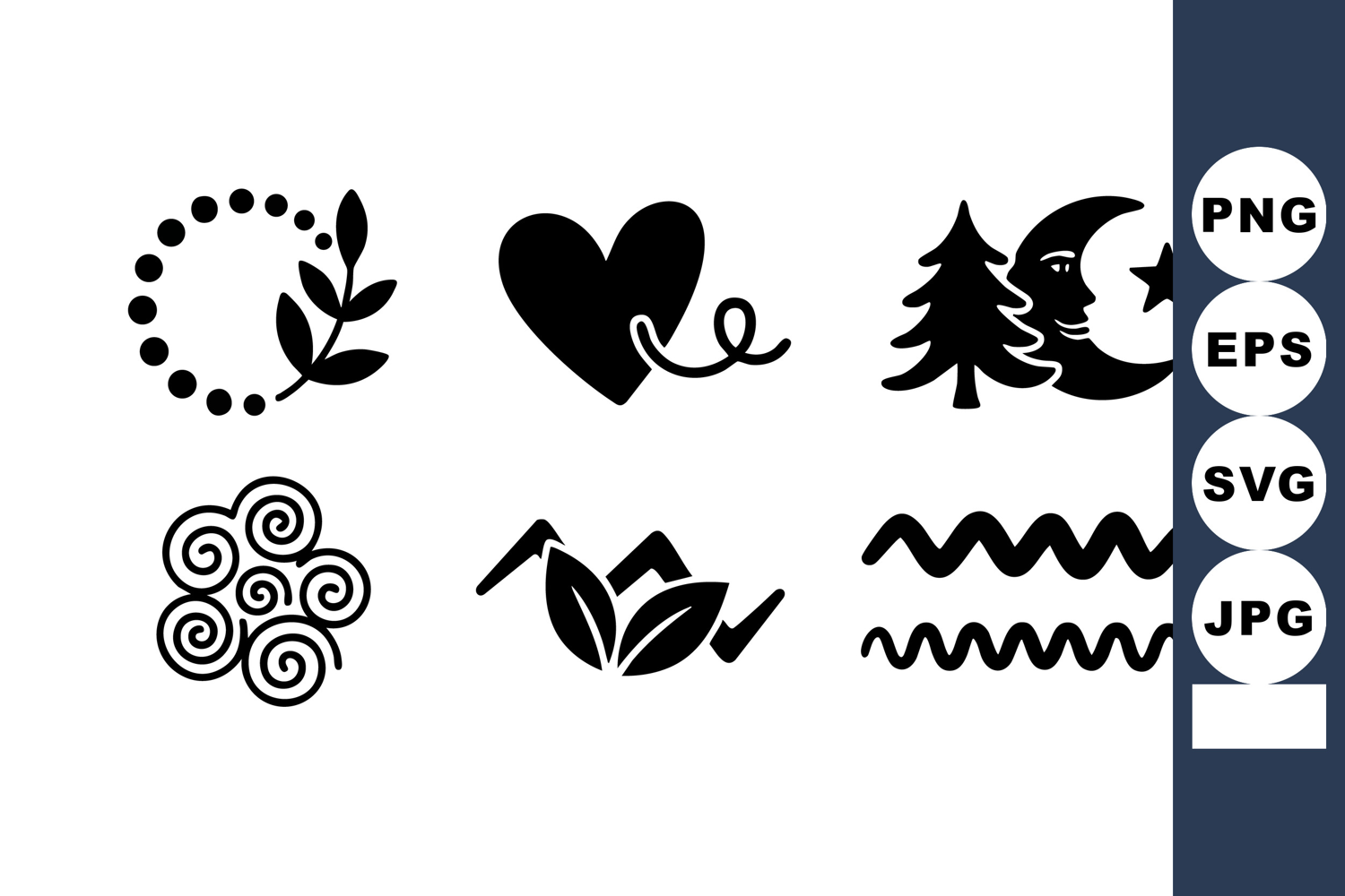 This vector file features black icons including leaves, heart, crescent moon, trees, spirals, and waves, designed for creative and natural themes with clear silhouette style, elegant mood.