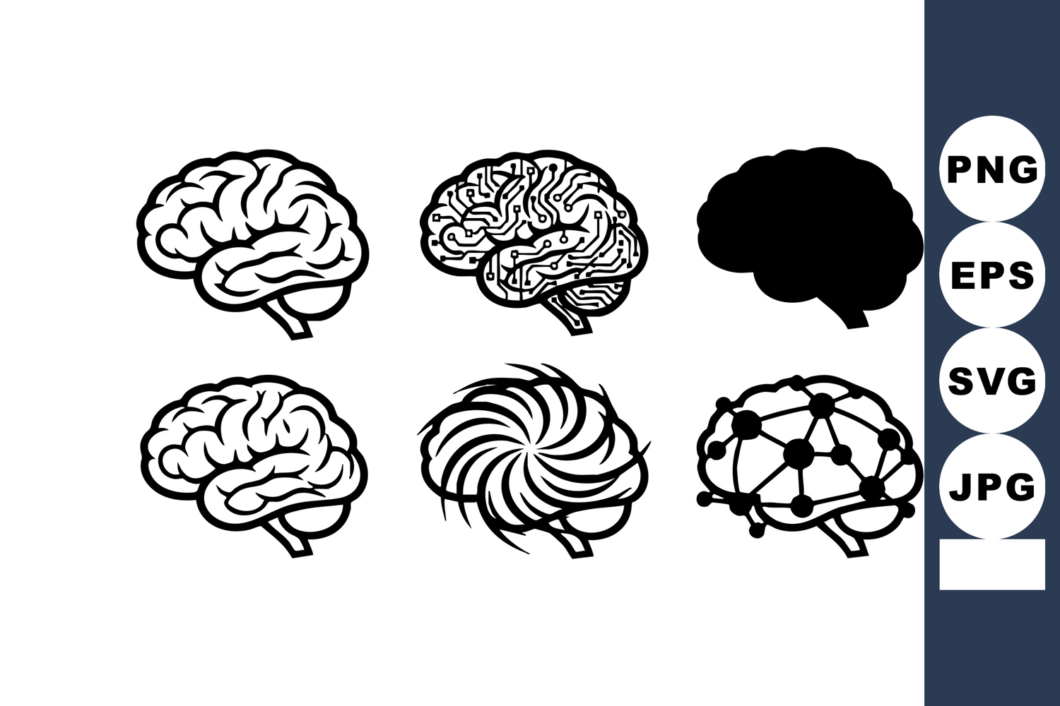 This vector file features six distinct brain icons representing various conceptual styles of the mind and intelligence. The black and white design emphasizes clarity and creativity. Thoughtful mood.