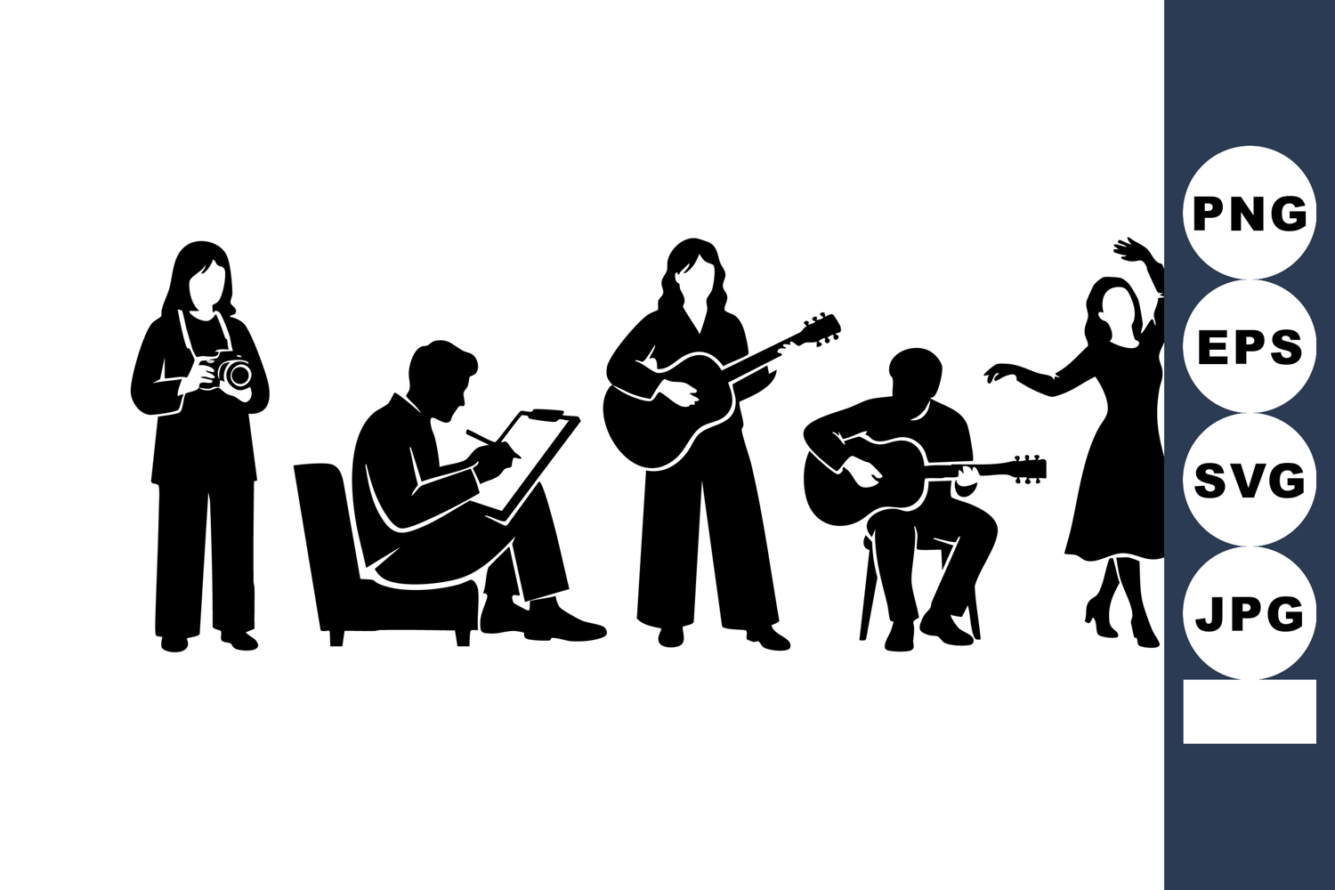 Black silhouettes show a group of musicians with saxophone and guitars, accompanied by a dancing woman, creating a lively artistic atmosphere. Energetic and creative mood.
