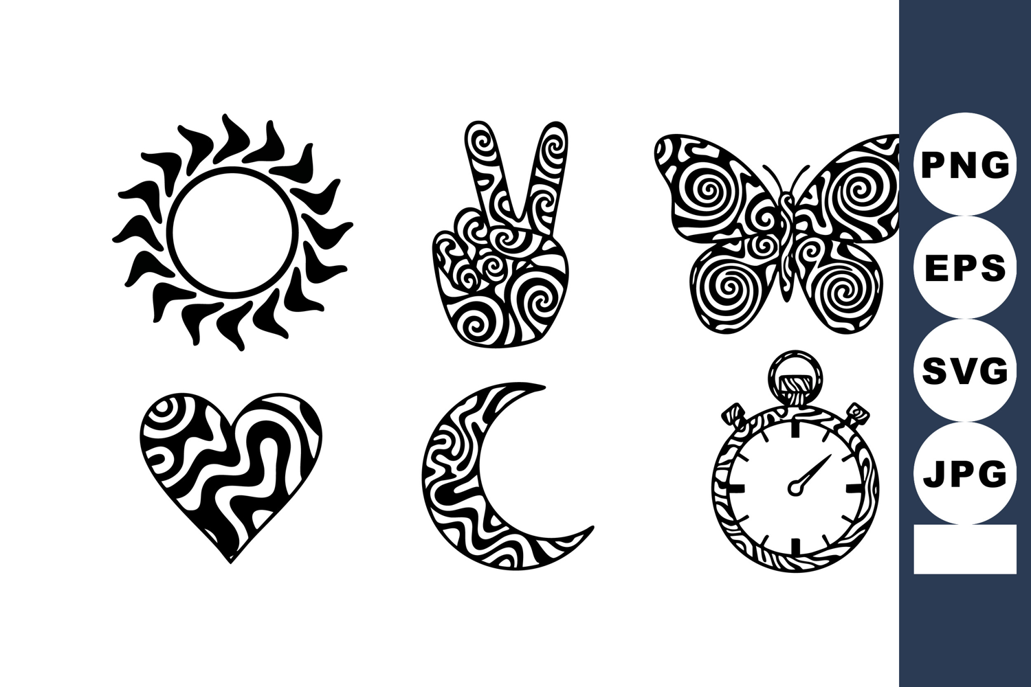 This vector features tribal style sun, peace sign, butterfly, heart, moon, and stopwatch icons in black and white with intricate patterns, offering bold and artistic visual appeal. Calm and creative mood.