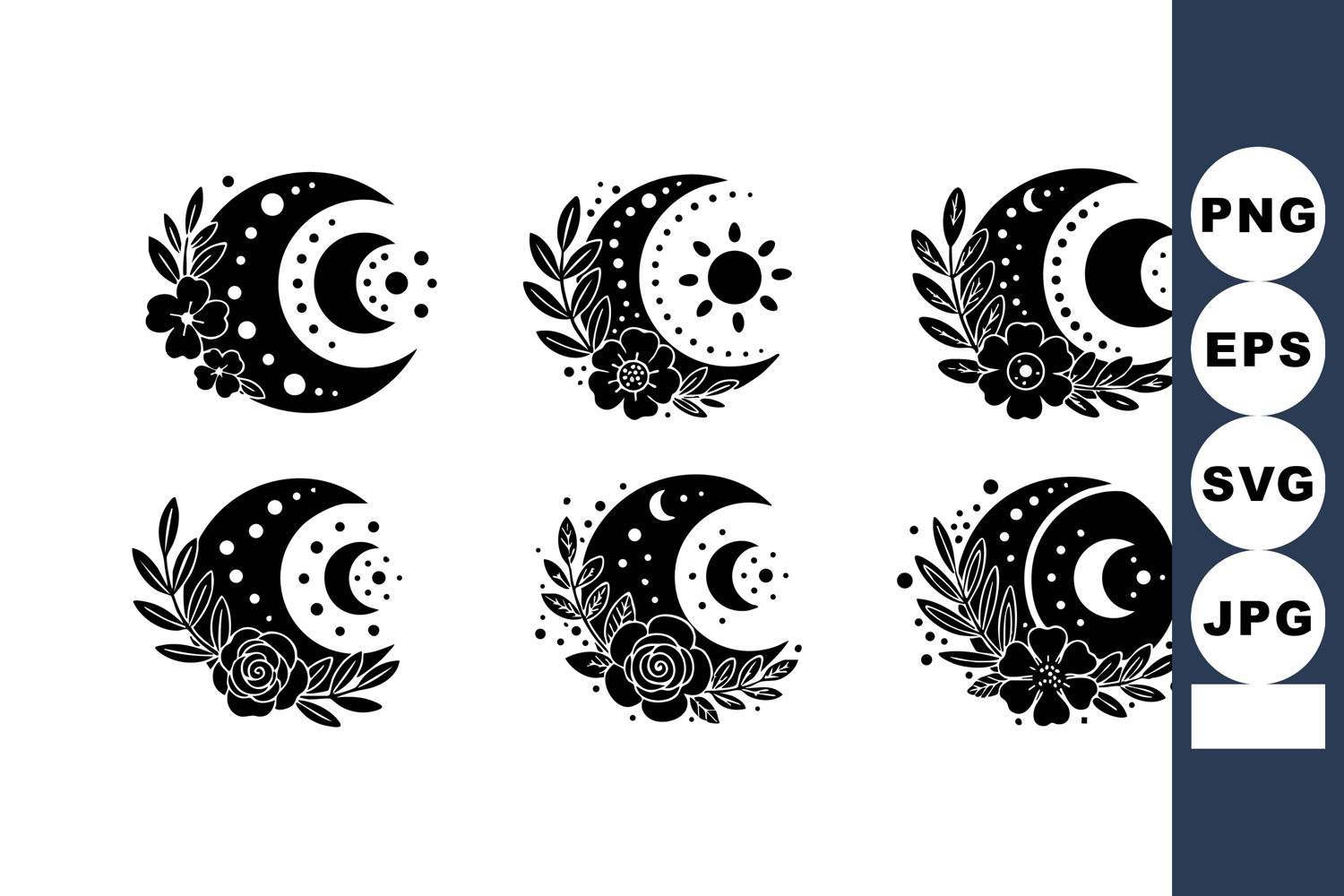 This vector set features crescent moons combined with sun and floral elements, decorated with leaves and petals in black silhouette style. It evokes mystical and natural vibes, artistic mood.