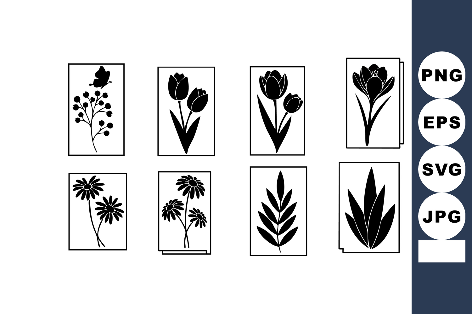 This vector set features black silhouette flowers, leaves, and plants in a simple and elegant style, suitable for decoration and design projects, evoking a minimalist and natural mood.