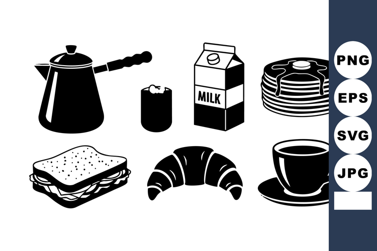 This vector illustration shows breakfast food and drink icons including a coffee pot, sandwich, croissant, pancakes, milk carton, candle, and coffee cup in black silhouette style. Calm.